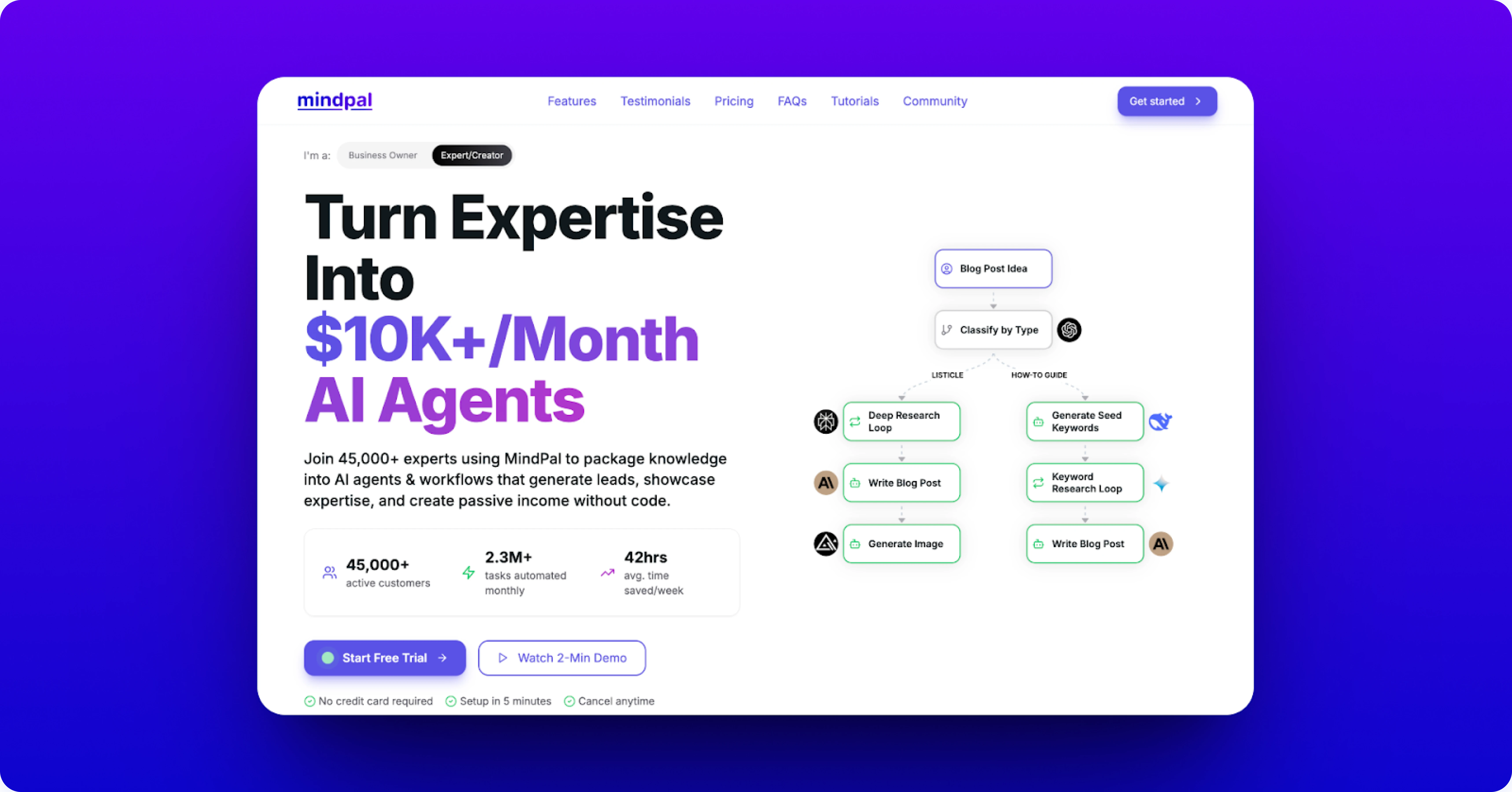 Trusted by 50k+ expert-based businesses worldwide, MindPal is a platform that empowers experts, coaches, and agencies to transform their unique business knowledge into powerful, custom AI agents and automated multi-agent workflows—no code required—for their team, clients, and audience. Let’s productize your expertise and scale your business.