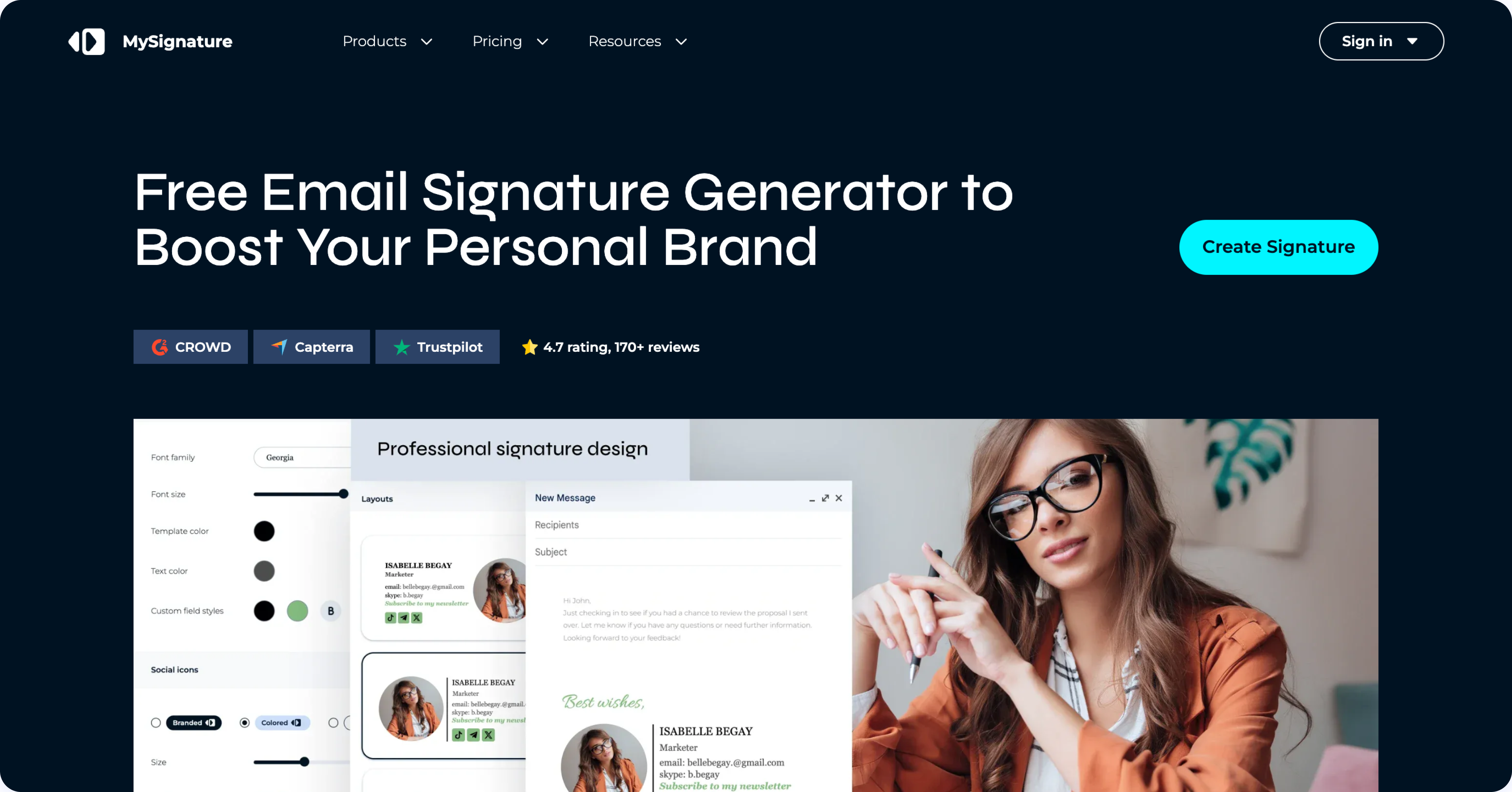 MySignature is an all-in-one platform that helps professionals stand out with stunning email signatures, email tracker, digital business cards, and link-in-bio pages.