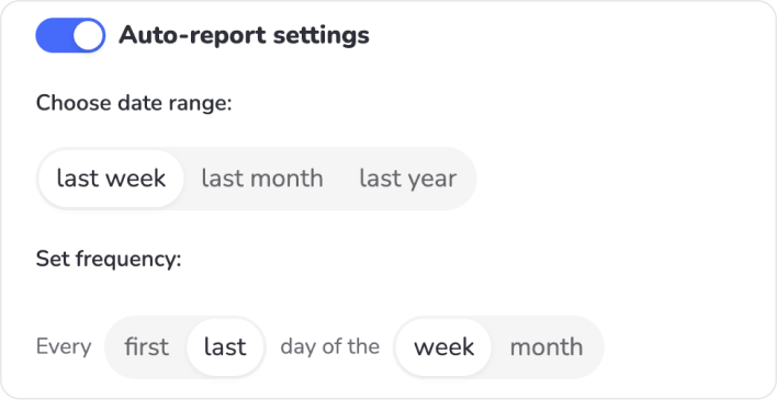 Wählen Sie Ihren Datumsbereich und legen Sie fest, wann Berichte generiert werden sollen. Localo wird Ihre Einstellungen automatisch in Zukunft anwenden und vollständige Berichte genau dann generieren, wenn Sie sie brauchen, jedes Mal.