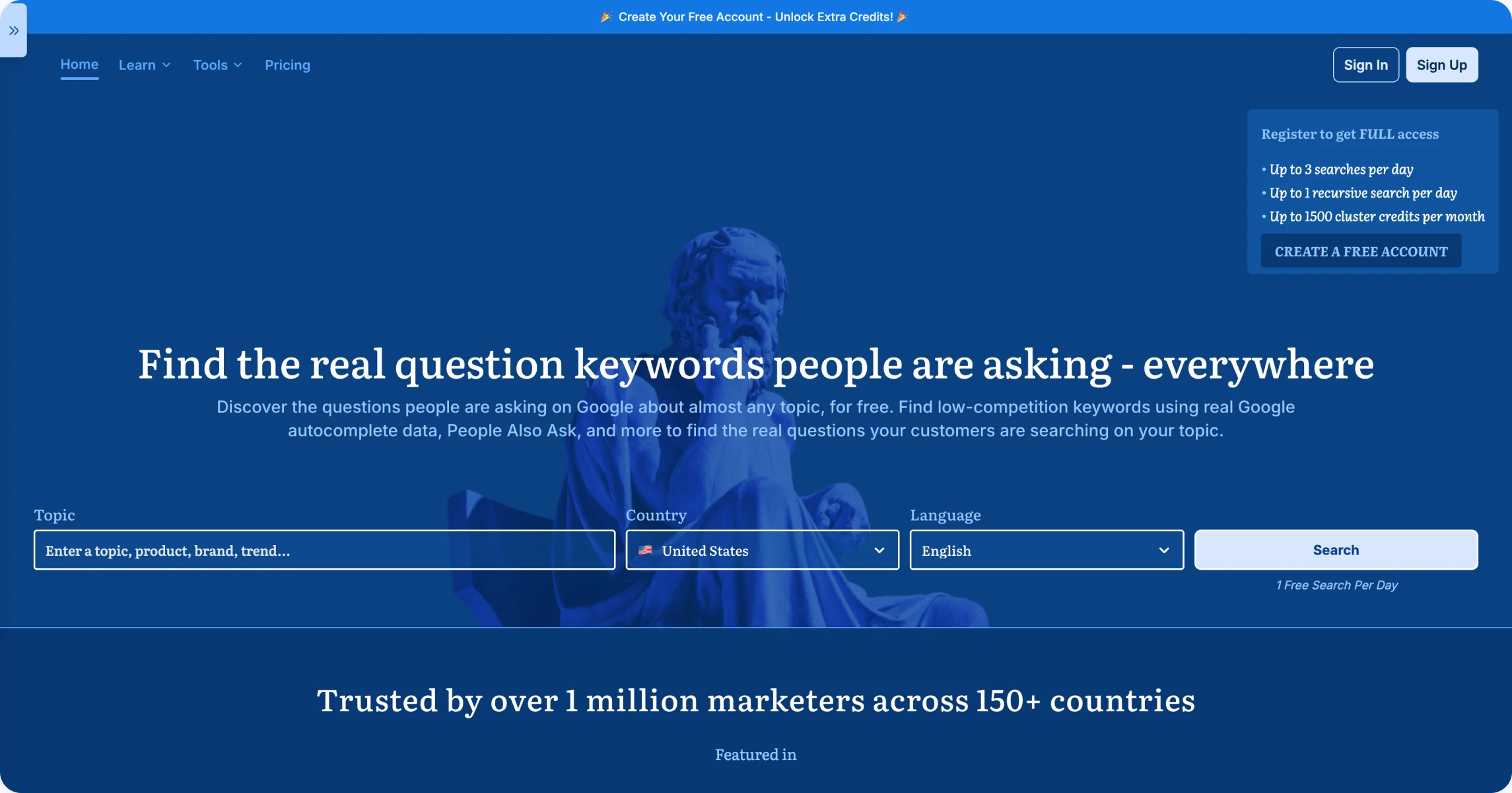 Answer Socrates encuentra todas las preguntas que la gente hace sobre tu tema y luego profundiza un nivel más con su búsqueda recursiva de preguntas. También encuentra palabras clave semánticas y de cola larga para que puedas construir autoridad temática y aumentar tu tráfico.