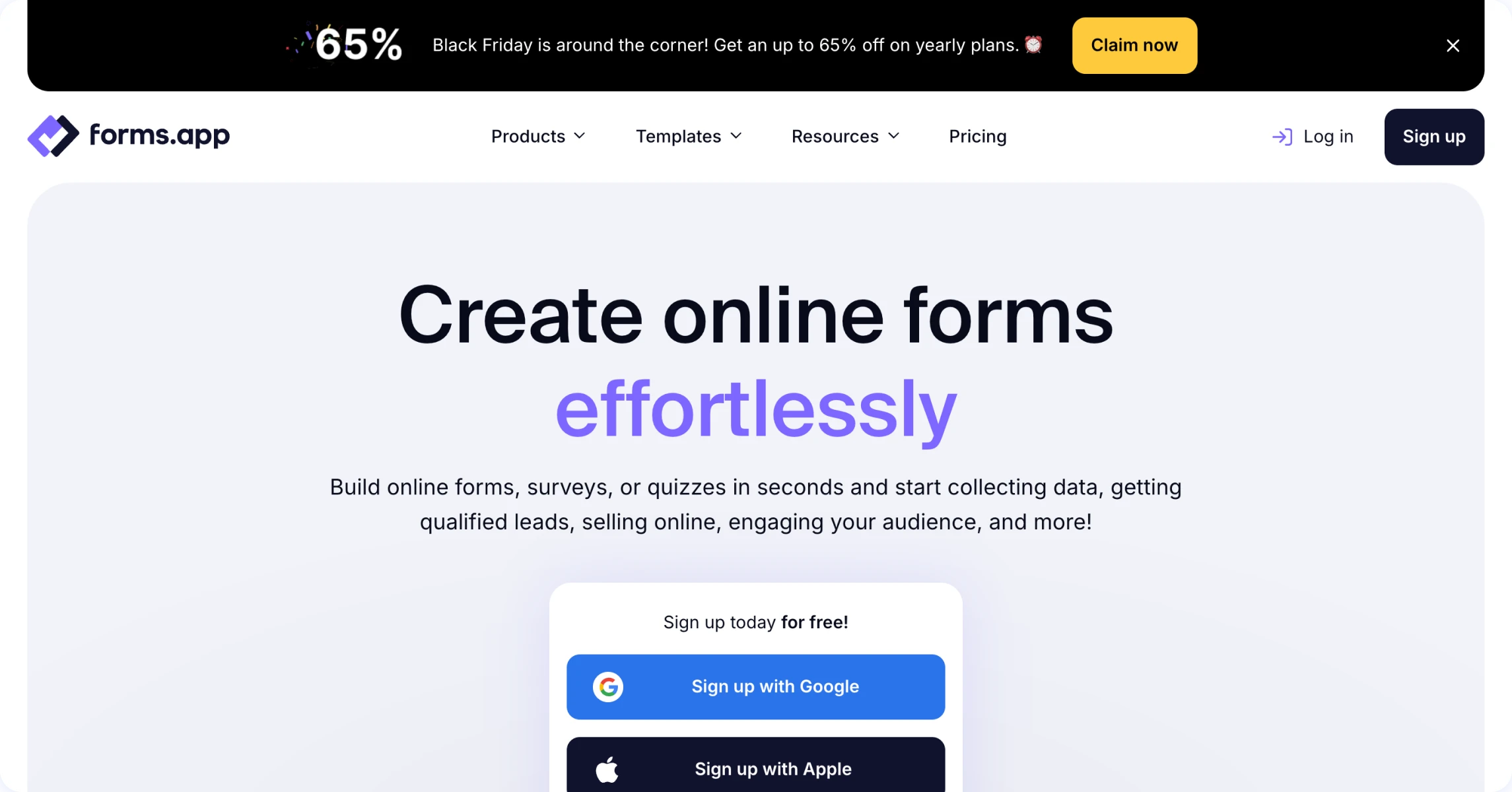 forms.app es un constructor de formularios en línea fácil de usar que ayuda a las empresas a crear formularios para registros, captura de leads, pedidos de ventas, firmas electrónicas, comentarios, cuestionarios de conocimiento y encuestas. Además, puede integrarse perfectamente en los flujos de trabajo y ayudar a automatizar la recopilación de datos.