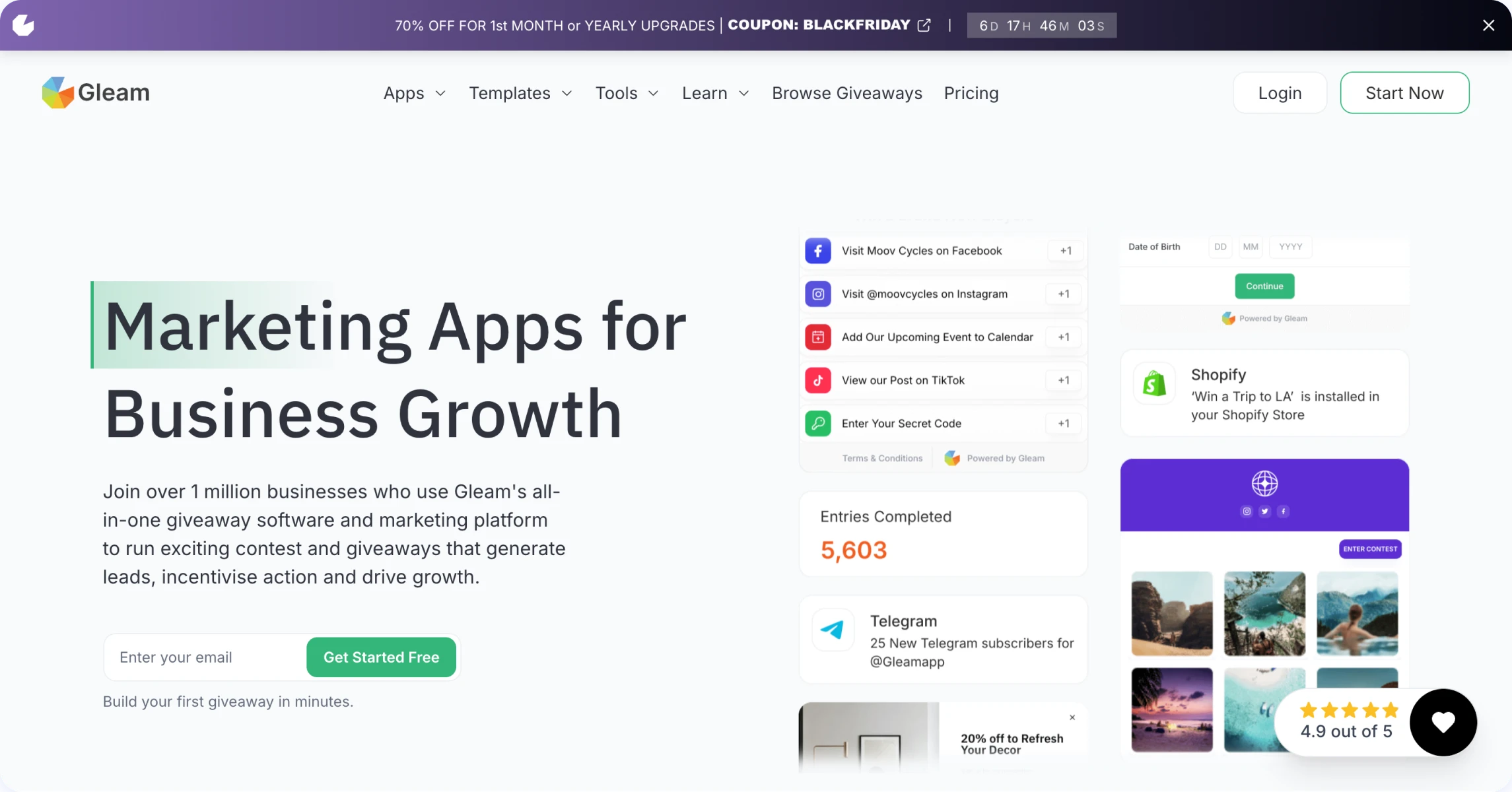 Gleam es una plataforma de marketing que ayuda a las empresas a realizar sorteos, concursos y campañas de recompensas para hacer crecer su audiencia. Las características clave incluyen configuración fácil de campañas, recopilación automatizada de entradas, análisis potentes, prevención de fraude e integraciones con las principales plataformas sociales y de correo electrónico.