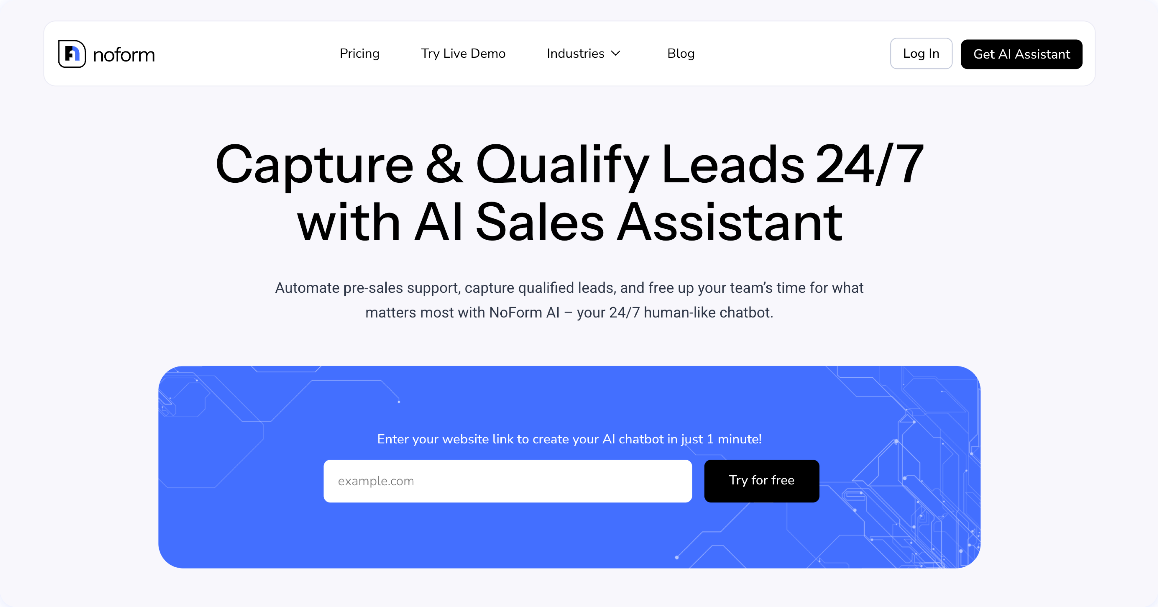 Noform AI es un asistente de ventas de IA 24/7 que convierte a los visitantes del sitio web en clientes de pago.