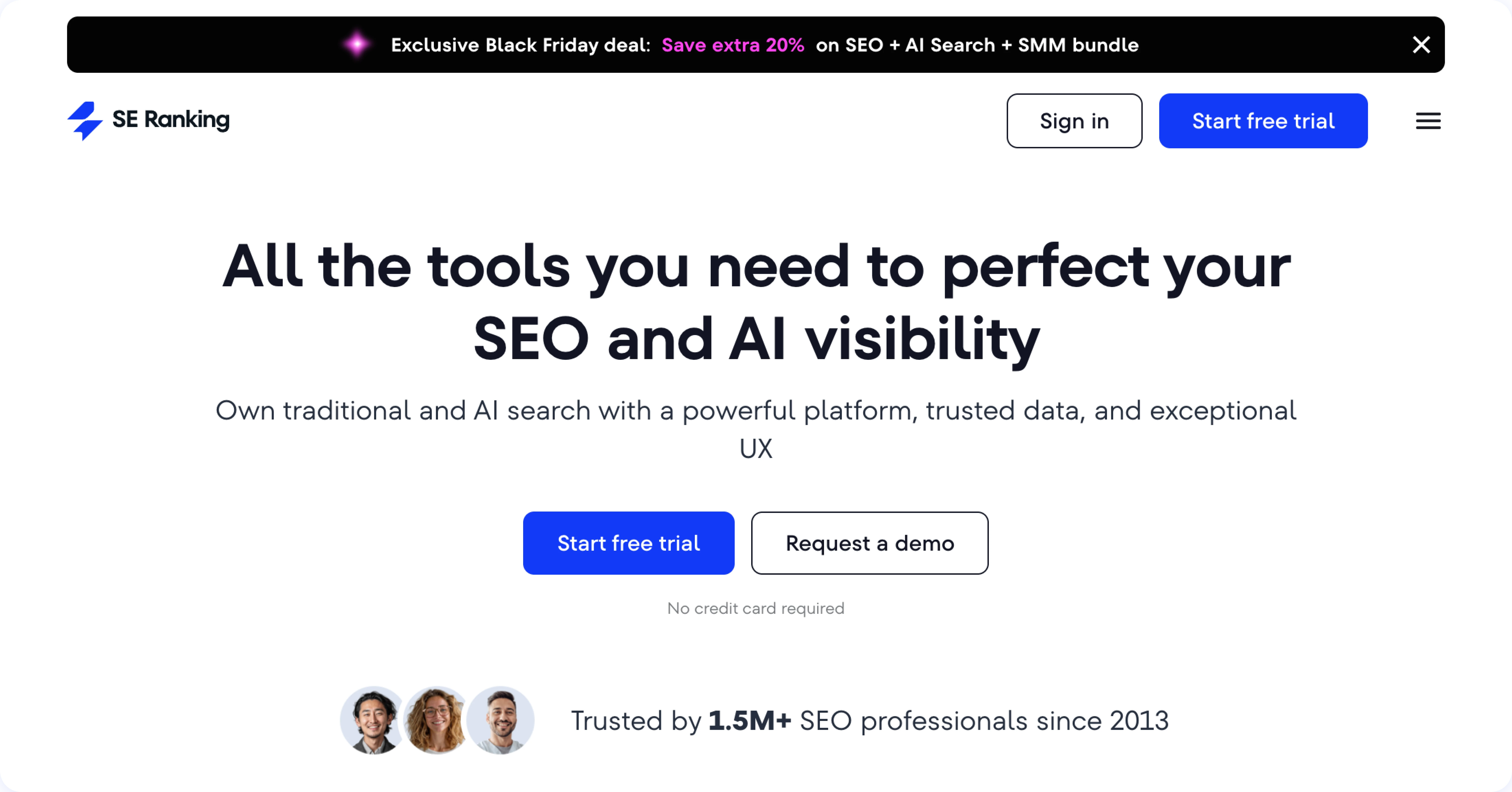 Este Black Friday, SE Ranking ofrece un generoso descuento del 20% en todos los planes anuales y complementos, además de tu descuento anual del 20% durante todo el año.