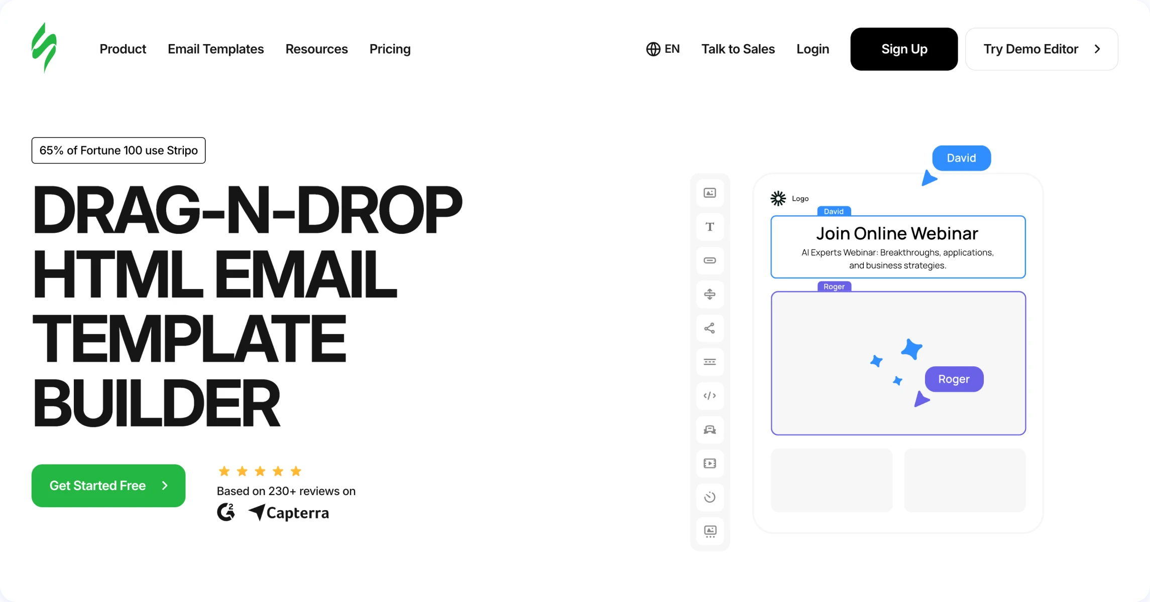 Stripo es una plataforma de diseño de correo electrónico todo en uno para crear correos electrónicos de cualquier complejidad realmente rápido. Integrada con 90 ESP/CRM, lo que te permite enviar tus correos electrónicos a tu sistema de automatización de marketing con solo un clic. Una serie de micro-herramientas integradas te dan todo lo que necesitas para correos electrónicos, desde editores de fotos hasta generadores de banners, desde temporizadores hasta interactividad y contenido en tiempo real.
