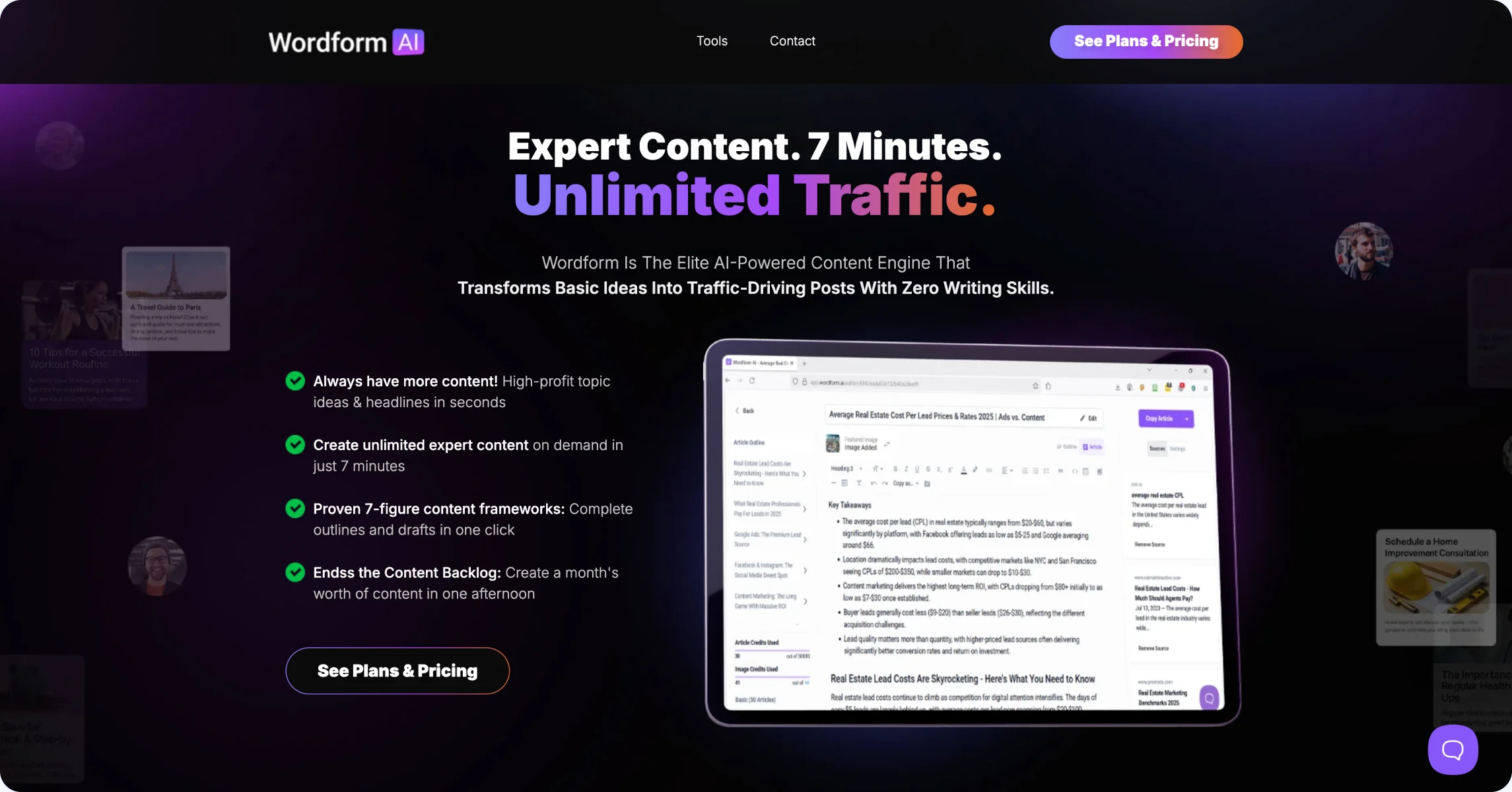 Créez rapidement du contenu qui génère réellement du trafic en utilisant un flux de travail propriétaire et une formule d’écriture. Wordform AI automatise la recherche, l’écriture et la publication et fait apparaître votre contenu dans la recherche IA et les recommandations.