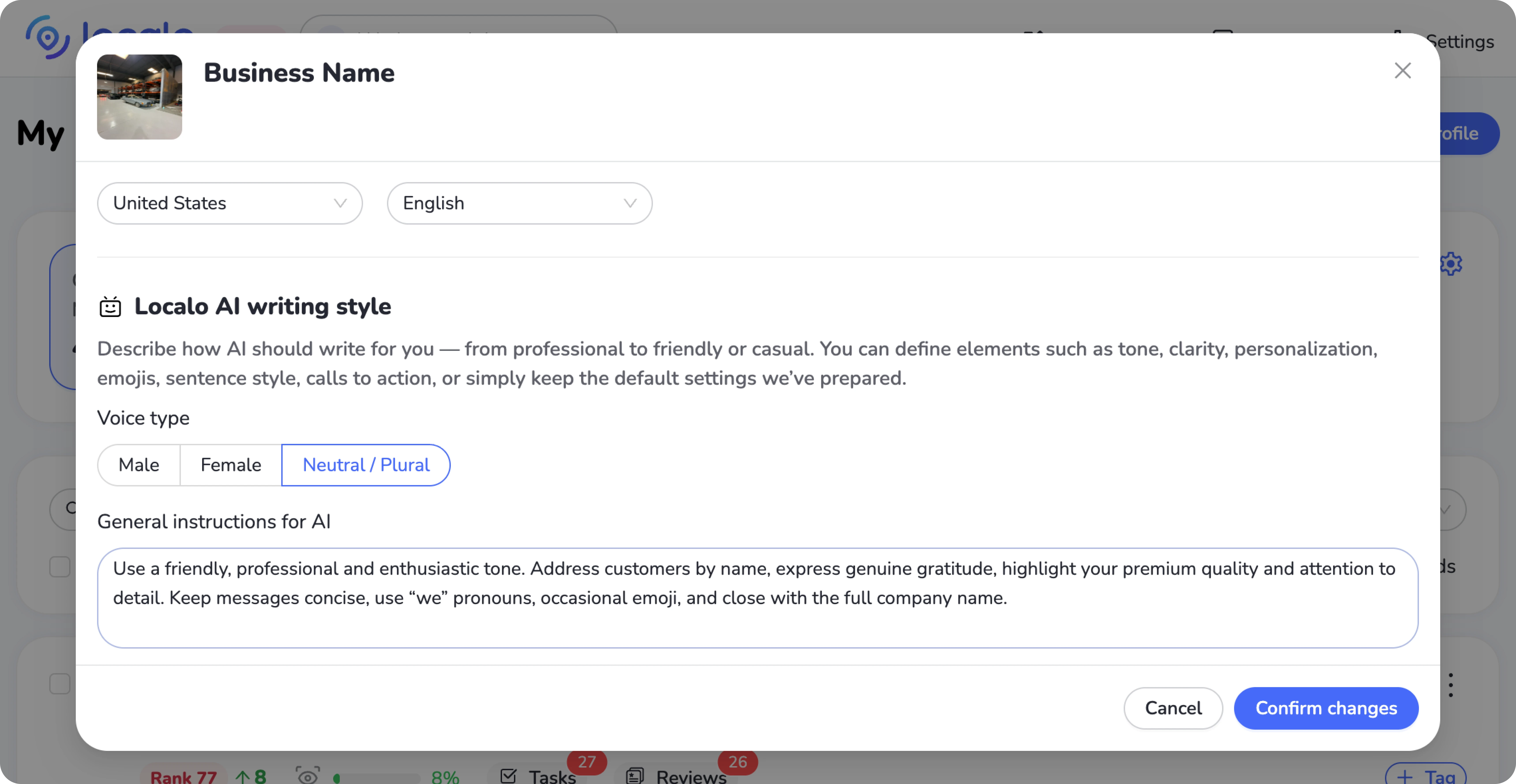 Le style de contenu Localo AI apprend automatiquement ces modèles de communication en analysant les réponses du propriétaire d’entreprise sur son profil d’entreprise Google. Il détecte s’ils utilisent « je » ou « nous », leur niveau de formalité préféré, et les expressions spécifiques qui rendent leurs réponses naturelles. Lorsque vous devez répondre à de nouveaux avis, Localo AI applique les modèles établis, générant des réponses qui sonnent déjà comme si le propriétaire de l’entreprise les avait écrites.