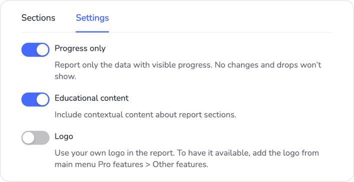 Activez ou désactivez des sections, affichez uniquement les progrès, ajoutez du contenu éducatif pour expliquer les métriques et personnalisez en marque blanche avec votre logo. Éditez les rapports auto-générés par client pour répondre à leurs besoins individuels.