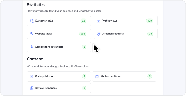 No more piling up local SEO data manually. We now automatically generate reports with Google Business Profile statistics, keyword rankings, and competitor analysis. You only check the drafts before sending it as an email, a PDF, or a shared link.