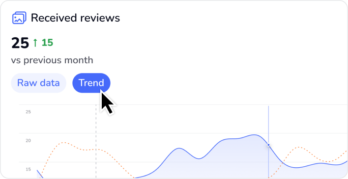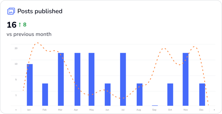 Zamieniamy kluczowe wskaźniki w czytelne wizualizacje. Wybierz tydzień, miesiąc, kwartał lub rok i porównaj go z poprzednim. Surowe dane i widok trendu pozwolą Ci śledzić codzienne zmiany i długoterminowe tendencje. Zestaw aktywność użytkowników z publikowanymi treściami i zobacz, co przyciąga ruch. A na koniec wyślij klientom podsumowanie wyników bez naszego logo.