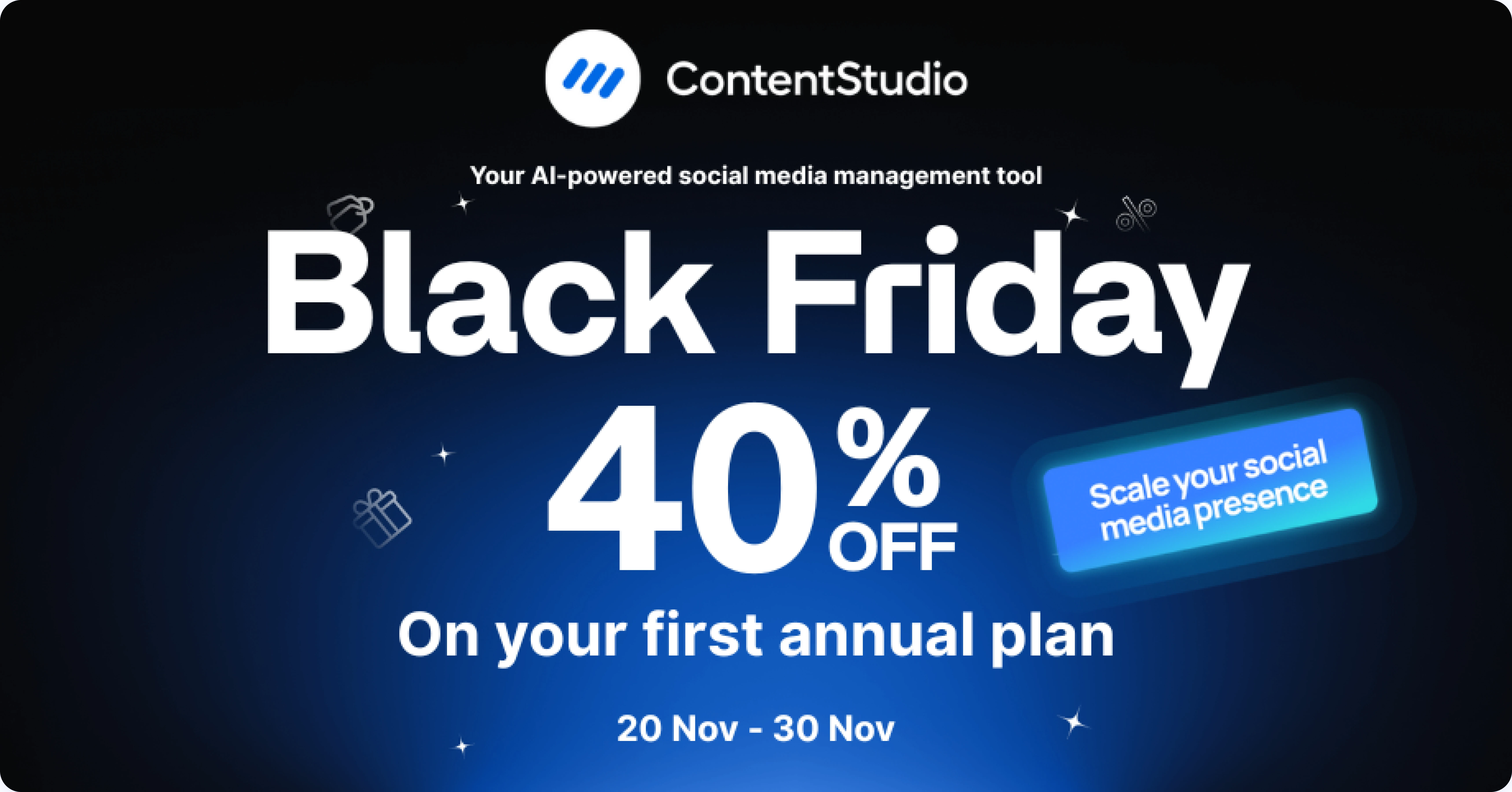 40% de desconto no seu primeiro plano anual com ContentStudio.