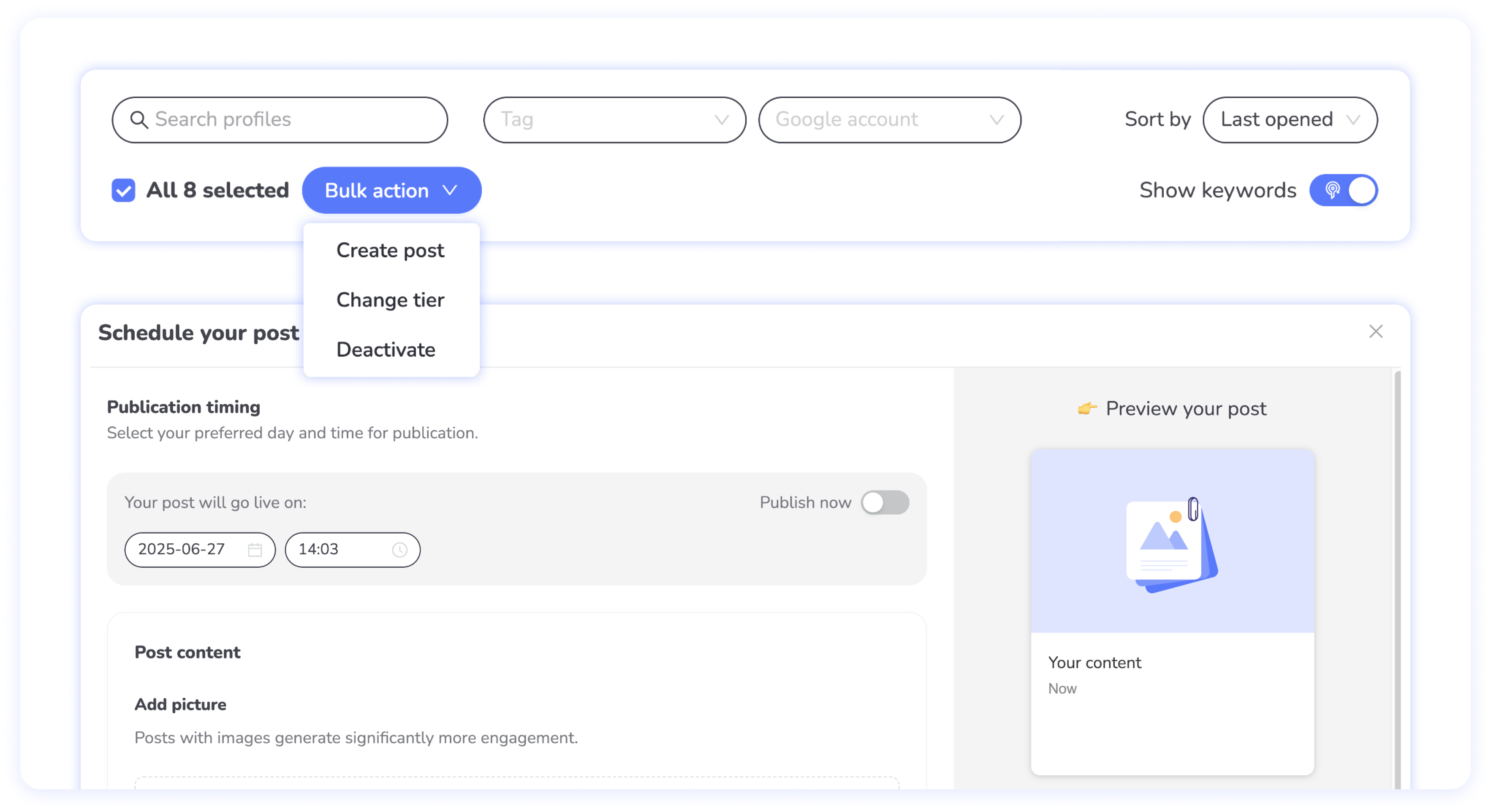 Passo 3: Criar conteúdo como sempre Crie, agende ou publique um post - adicione uma foto, escreva conteúdo com ajuda da IA, defina quando deve aparecer. Nada muda na forma como você cria conteúdo.