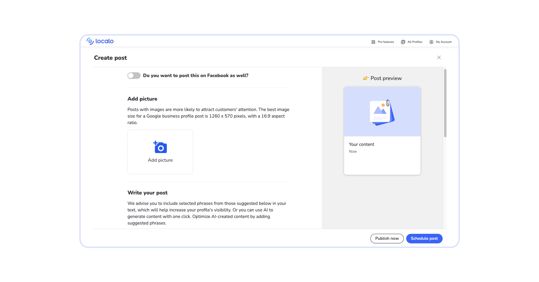 Se você não souber como criar postagens valiosas e ideais para sua empresa no Google, poderá usar as diretrizes da auditoria da sua empresa no Localo. Isso lhe dirá qual deve ser o tamanho de sua postagem e quais palavras você deve usar para que sua empresa cresça mais no Google. Você também pode agendar várias postagens de uma vez, que serão publicadas nos dias e horários definidos por você.