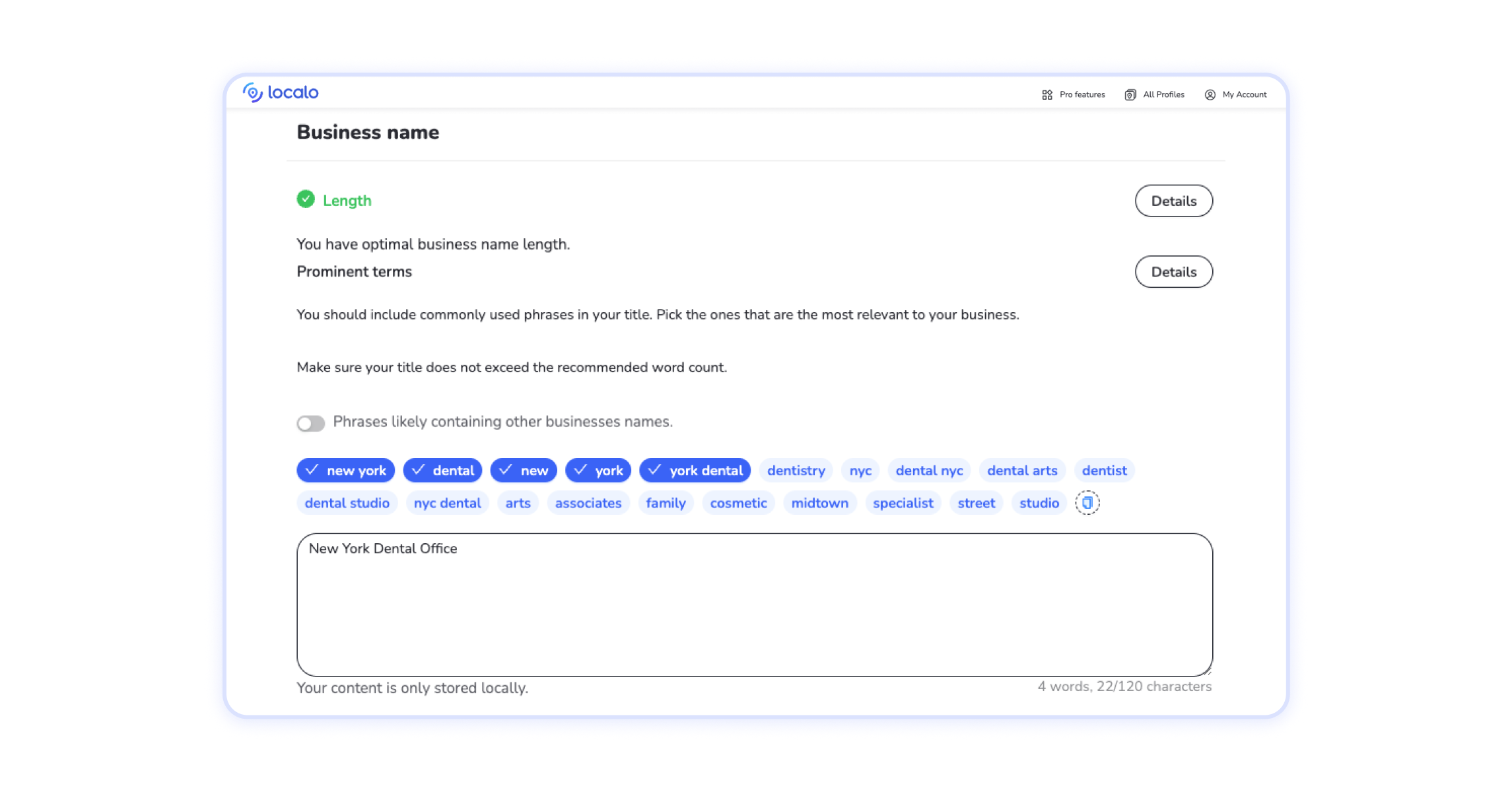 A Localo lhe dirá qual deve ser o tamanho do seu título para que ele não seja curto, mas também não seja longo demais em comparação com seus concorrentes. Se houver algo errado com seu título, você receberá um comentário aqui.