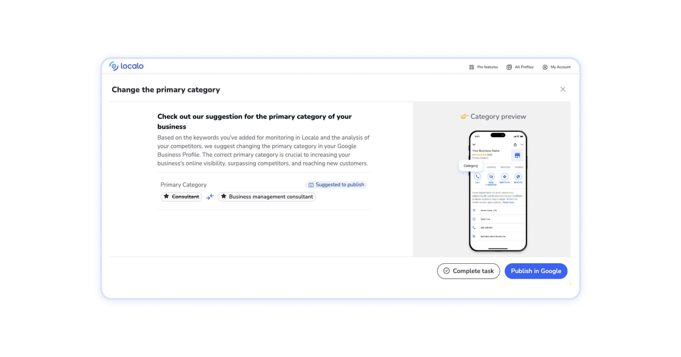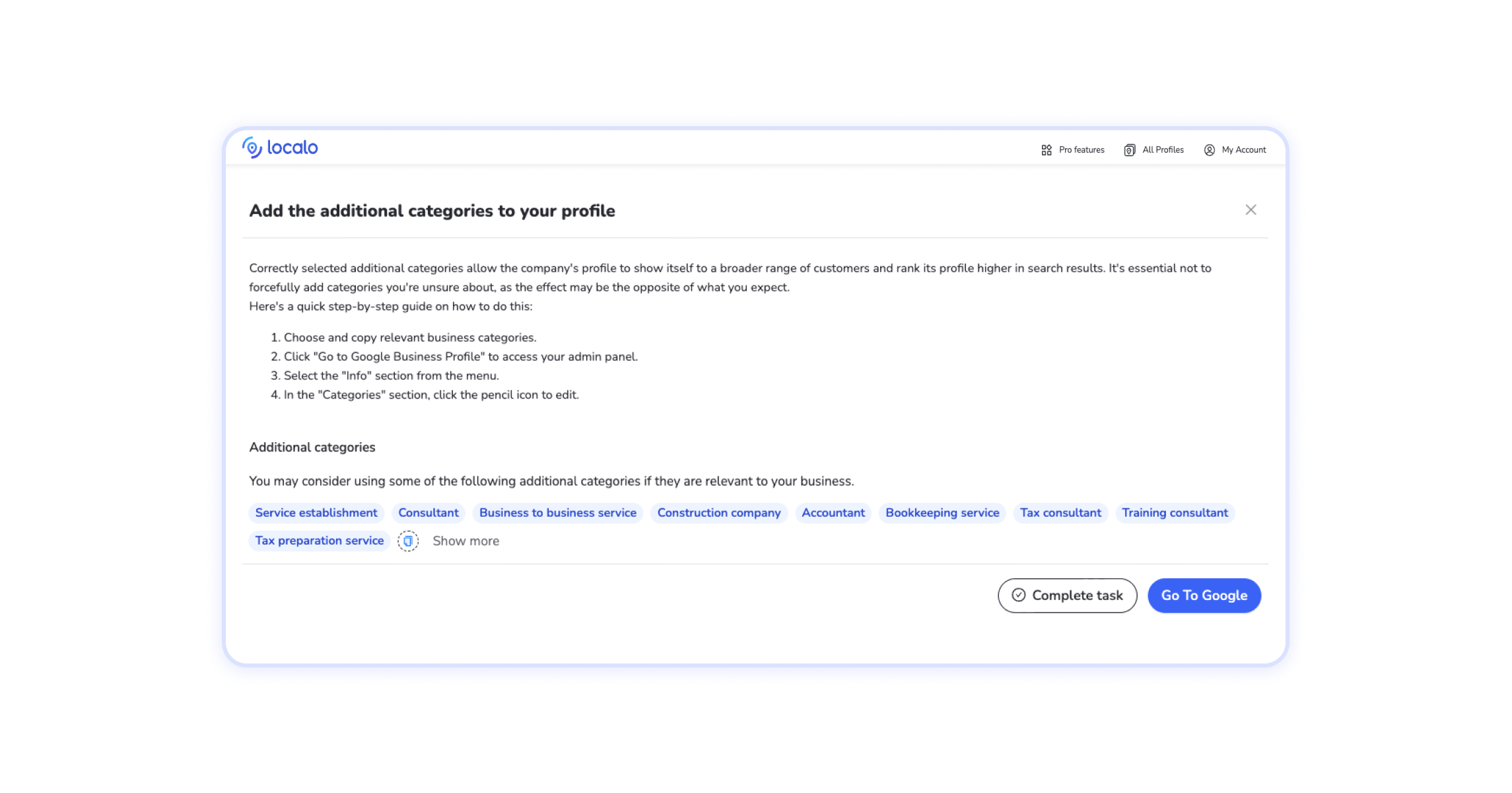 Abra sua auditoria de negócios na Localo e vá para a seção de categorias adicionais. Você verá uma análise das melhores categorias adicionais que podem ser adicionadas ao seu perfil comercial do Google. Escolha as que são mais relevantes para sua empresa e adicione-as.