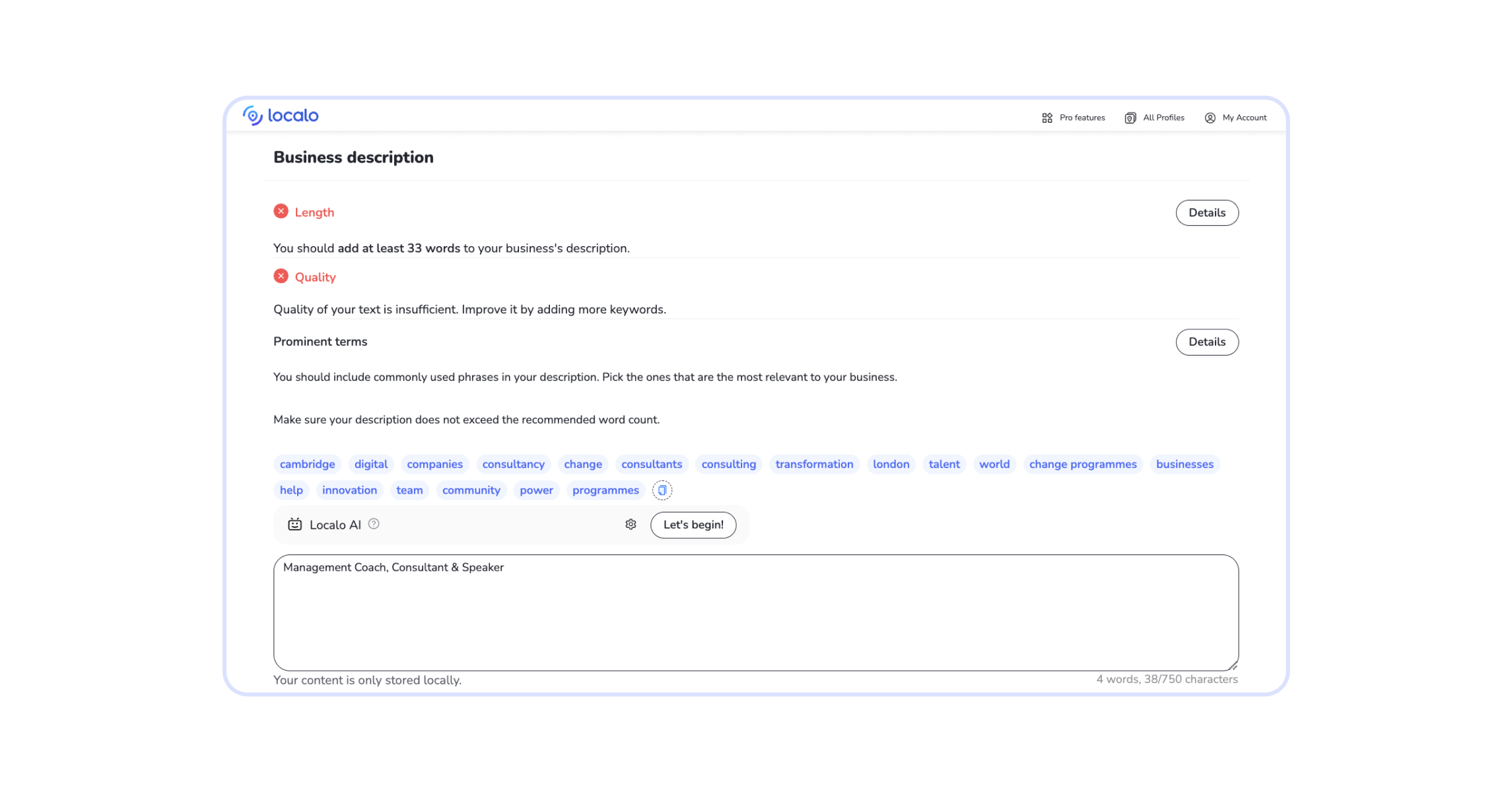 Esse processo é trivialmente simples, mas incrivelmente eficaz. Primeiro, abra uma auditoria do perfil da sua empresa no Localo e vá para a seção de descrição da empresa.