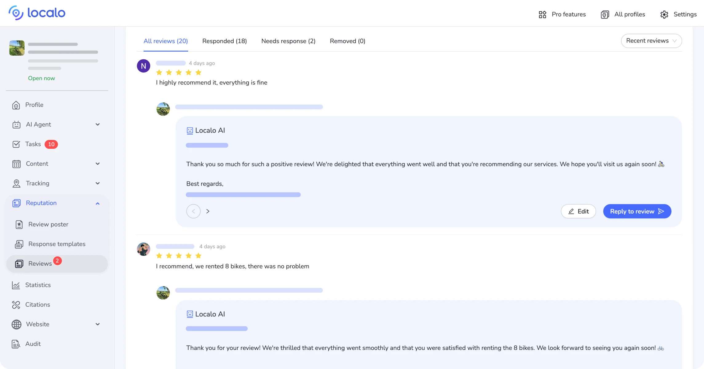 Simplifique seu gerenciamento de avaliações Gerenciar avaliações através de múltiplas plataformas pode consumir tempo. Ferramentas como o software de gerenciamento de avaliações da Localo te ajudam a monitorar, responder, e rastrear avaliações de um painel central, garantindo que você nunca perca uma oportunidade de se envolver com clientes.